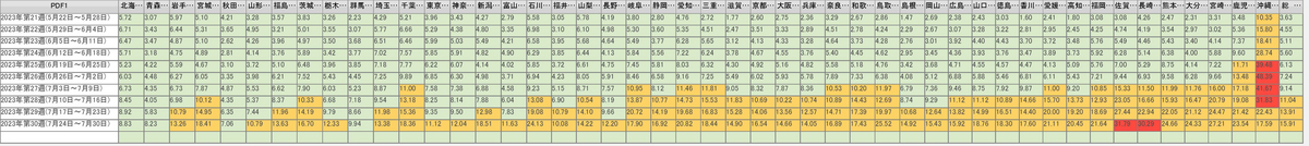 筆者がこの拠点平均感染確認者数については,五類後の発表数字を分析する--1日あたりの感染確認者数を計算し第9波に向けての増加傾向を把握へ - jeyseni's diary (hatenablog.com) 2023/6/22 の段階で判断基準を示している。毎日最低1人の感染確認者が全国で出ることが「7人」という数字で出る。現在の全国平均は15人を超えている。10人を超えたから注意報だというのだが,すでに増加傾向が連続している段階では,「警報になる可能性が極めて高い状態」である。一般の天気などでは,注意報の場合は被害が出ずに収束することが多いのだが,新型コロナに関しては,今のところ収束,あるいは均衡状態になっているのは,沖縄県だけだからである。